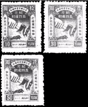 1947年5月4日,解放區(qū)東北郵電管理局發(fā)行紀(jì)念五四運(yùn)動郵票1套3枚,分綠、淡棕、紫色三色,面值分別為10元、30元、50元。主圖為一支巨手持斧砍斷象征專制統(tǒng)治的鎖鏈,兩側(cè)空白邊框內(nèi)為兩條標(biāo)語:“打破專制枷鎖”,“爭取民主自由”。這套郵票的設(shè)計者是張修平,他曾參考俄國十月革命后發(fā)行的郵票圖案,巨手握著寶劍砍斷鎖鏈,象征無產(chǎn)階級革命沖毀資本主義枷鎖。
