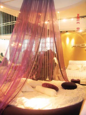 浪漫,只有跟最愛的人在一起,才能體會,才是現(xiàn)實(shí)。張麗星家具展廳里最打眼的,當(dāng)屬這款兩米見方的安吉思情人大圓床:大紅色的床身、高垂而下的紫色幔帳,隨手可觸的黃色海綿抱枕,看到這充滿浪漫情調(diào)的盛滿愛的溫床,你多想像《浪漫櫻花》里一樣,和自己心愛的人一起,體味這種相濡以沫的浪漫。