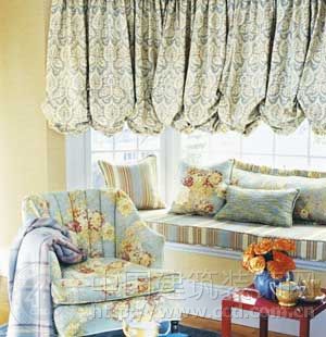利用窗簾本身的垂墜線條形成自然的花形褶皺效果,突出圓弧窗本身的造型。亦可采用豎向手拉褶皺式的設計來掩蓋窗戶本身的圓弧造型。