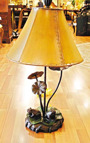 推薦理由:這盞工藝臺(tái)燈,底座造型如同是池塘田田荷葉中的一片,綠色的“荷葉”給人帶來一股生機(jī),帶給人美好的想像空間。同時(shí),還有幾朵荷葉,在奮力向上吸取天地之間的雨露。而兩只青蛙正仰天朝向光源處。打開燈,幻真幻假之間,如同是在黃昏時(shí)候,聽取蛙聲一片