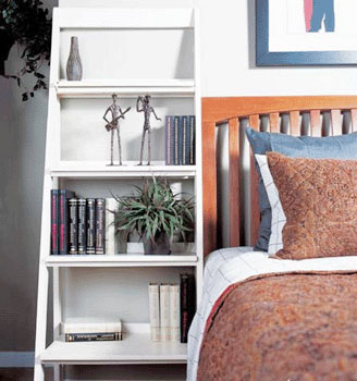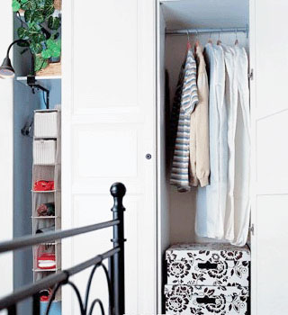 衣柜和墻之間也有收納空間。在衣柜和墻之間的空當里,用擱板打成隔斷,上部放置一些花草等綠色植物,讓臥室充滿春的感覺;下部可以懸掛一個儲物袋,放置小件的衣飾,如領帶、絲巾等。