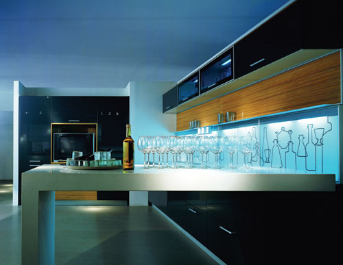 冷峻的黑色櫥柜,工業(yè)設(shè)計(jì)感極強(qiáng)的白色吧臺(tái),現(xiàn)代化的視聽組合,暗藏彩燈的壁柜,甚至還有大做文章的墻壁,以不銹鋼擱板為界,上面是原始?xì)庀⒌哪?,下面是線條簡潔的圖。如此分明的方式,組合著這些傳統(tǒng)和非傳統(tǒng)的事物,廚房陡然間變成各種新奇事物的展示臺(tái)。