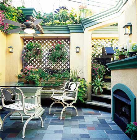 戶外的木質(zhì)格子架與暖黃色的墻面、冷色調(diào)的地磚形成對(duì)比,讓小空間看起來(lái)溫馨而明亮。室內(nèi)設(shè)計(jì)元素,如院墻上像室內(nèi)石膏線一樣的綠色裝飾、壁爐上的擺設(shè)、頂部的吊扇,都讓人忘記這是在戶外。