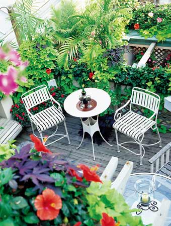 下沉式花園的上面,是一個(gè)實(shí)用的小露臺(tái)。質(zhì)樸的木地板和茂盛的植物,是打造休閑感覺(jué)小庭院或露臺(tái)的有力手段。