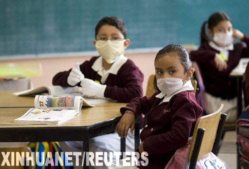 5月11日,戴著口罩的小學(xué)生在墨西哥首都墨西哥城的一所小學(xué)上課。當(dāng)日,因受到甲型H1N1流感疫情影響停課的墨西哥中小學(xué)和學(xué)齡前教育機(jī)構(gòu)開始復(fù)課。 新華社/路透
