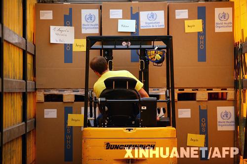 世界衛(wèi)生組織提供的照片顯示,5月5日,工作人員在瑞士羅氏公司在凱澤勞斯特的配送中心搬運(yùn)藥品。羅氏公司12日宣布向世衛(wèi)組織捐贈(zèng)總共565萬個(gè)療程的抗病毒藥“達(dá)菲”,以幫助應(yīng)對(duì)當(dāng)前的甲型H1N1流感疫情以及可能由此引發(fā)的流感大流行。 新華社/法新
