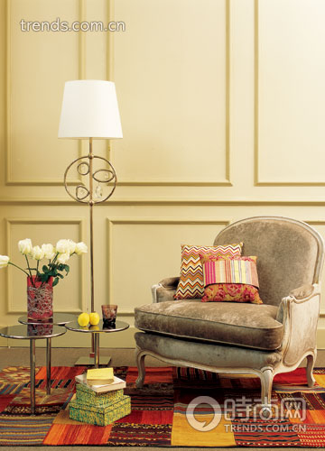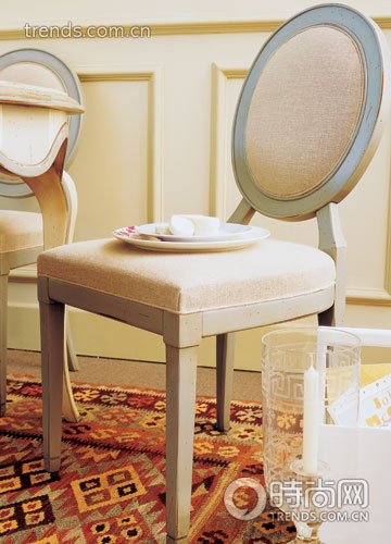 圖案多變的中東地區(qū)的手工地毯,更襯托出椅子的線條簡潔利索,一旁穩(wěn)穩(wěn)站立的大型擋風燭臺很有古香古色的味道。