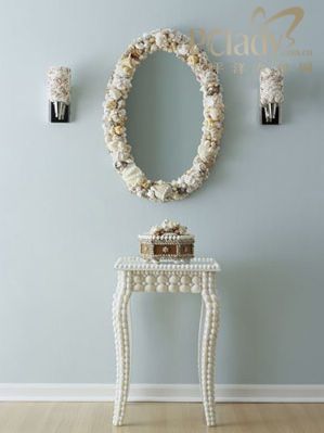 2 、不同的物件要選擇合適的貝殼來搭配。雞尾酒桌和壁式燭臺僅僅用了一、兩種貝殼;鏡子與盒子上卻聚集了各種形狀和大小的貝殼,看似隨意,實際上都是經(jīng)過細心安排的。