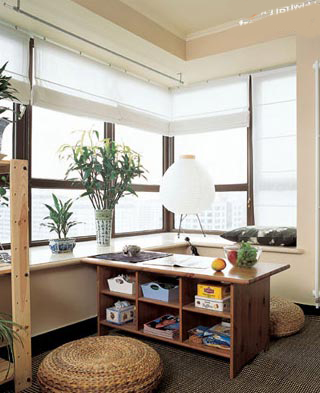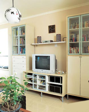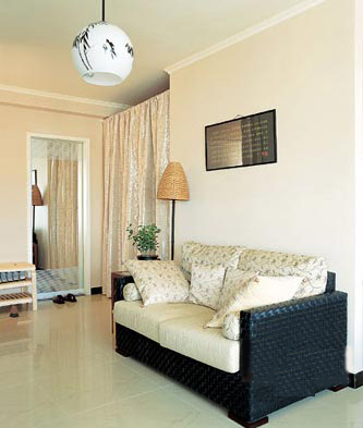 一個人住很少自己在家做飯,盡管姜愫有著一手的好廚藝,但看來是一般朋友所享受不到的。因而她將原來的封閉式廚房改成了開放式,使得客廳的空間得到了擴展。其實對于一個人來說,客廳的利用率要遠遠超過對廚房、衛(wèi)生間、臥室的使用,獨處時或和朋友相聚,這里總是首選。除此之外,姜愫還把客廳做了很好的劃分,一個是視聽區(qū)域,一個則是會客區(qū)域。會客區(qū)是和廚房緊密相連,這樣拿取飲料或者想隨便做點什么,朋友和自己都會很隨意,為了讓空間顯得盡可能的寬敞些,而不至于讓朋友們覺得擁擠,姜愫沒有選擇常規(guī)的桌椅沙發(fā),而是采取了日式的風格,一塊地毯劃分了這塊區(qū)域,上面是矮矮的蒲團和矮矮的桌子,親密的朋友團坐在上面很愜意,緊靠著的飄窗也讓這里的視野很開闊。而視聽區(qū)域通常是自己獨自享受的,平時想一個人的時候,靜靜地背靠在心儀的沙發(fā)上,看張碟片或者聽聽音樂,都是美妙至極的。