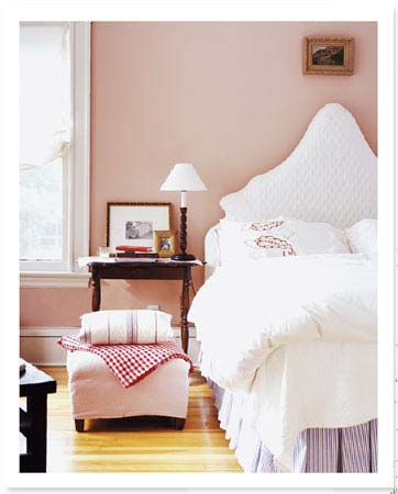 搭配建議:明亮的白色床品對(duì)比略帶灰度的粉珍珠色墻體,帶來(lái)透氣感。桃紅色沙發(fā)布藝,配以活潑的花卉圖案,使房間局部更為鮮亮。