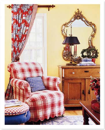 搭配建議:布藝沙發(fā)和窗簾的紅色,以及抽屜柜溫暖的舊木色,搭配淡黃色墻面,構(gòu)筑起溫暖而田園的意境??堪?、瓷器、窗簾上的青藍(lán)色圖案,則以冷色的點(diǎn)綴,平衡著視覺(jué)。