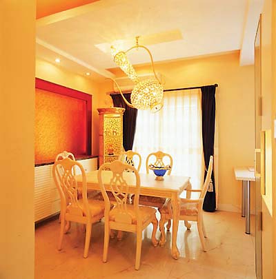 圖解:盡管奢華的歐式風(fēng)情四處可見,但主人還是選擇了一些其他地域的元素,以體現(xiàn)自己的個性。最引人注意的就是那些燈具,基本上都很富麗堂皇,但形狀很豐富,功能也很討巧,比如餐廳頂部的那只巨大的***式的酒壺?zé)簦煨腿A麗,構(gòu)思巧妙。而餐桌邊上的一只花格柜子,有清晰的印度特色,與餐臺上的玻璃器皿相映成趣。