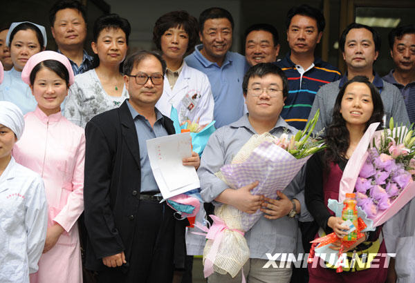 5月17日,我國內(nèi)地首例甲型H1N1流感患者包某某(前右二)和女友(前右一)父親(前右三)與醫(yī)務(wù)工作者合影留念。當(dāng)日,經(jīng)過衛(wèi)生部、四川省、成都市的醫(yī)療專家組科學(xué)有效和精心細(xì)致的治療,我國內(nèi)地首例甲型H1N1流感患者包某某治愈出院。新華社記者陳燮攝