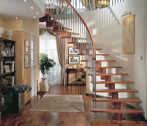 弧形微旋向上式樓梯。優(yōu)點(diǎn)是美感足,韻味佳,很能活躍空間氣氛。缺點(diǎn)是使用不當(dāng)就會(huì)浪費(fèi)空間。由于是弧形,造型方面可以選擇更大膽、更張揚(yáng)、更前衛(wèi)的。在色彩上,既可以選擇與室內(nèi)色彩一致的近似色,也可以摒棄常規(guī)思路,選擇對(duì)比色調(diào),讓樓梯作為“精美雕塑”在室內(nèi)跳躍而出。開動(dòng)一下想象力,你穿著一件白色浴袍,拿一本《復(fù)活》,拾階而上,行至半空,突然就懶洋洋地坐下了,此時(shí)夜色如歌,室內(nèi)幾點(diǎn)燭光,音響里飄出《藍(lán)色狂想曲》。。。。。。