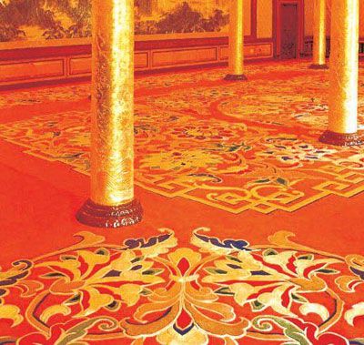 概要: 手工地毯以純手工制做,多以純羊毛和真絲為材料,前后經過圖案設計、配色、染紗、上經、手工打結、平毯、片毯、洗毯、投剪、修整等十幾道工序加工制作而成。它可以將幾十種色彩和諧地糅合在一起,緊密精致的毯面可以使地毯的壽命延長到幾十年上百年。如此繁瑣的工藝,使得制做一塊毯子的時間需要從幾個月到一兩年不等。
