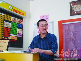 王欣欣2008年畢業(yè)于東北師大。大四那年,他曾經(jīng)闖蕩深圳找工作,后來考研沒有成功,便選擇在濟南開起一家餛飩店。當起小老板的王欣欣依然一臉學生氣。 吳金彪攝
