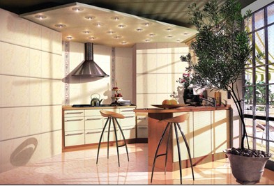 在廚房中可以選擇一套立體圖案的花式瓷磚類點綴平淡的墻面,為主婦下廚增添愉悅的氣氛。市場上的立體瓷磚以歐洲舶來品居多,有的主打藝術、時尚風格,有的重點放在自然萬物的生趣,一般一套六塊、十塊,個性很是鮮明。進口花式瓷磚多適用于十平米以上的廚房,這樣才能成套展示效果,價格自然也不菲,一般一塊就在百元上下。