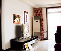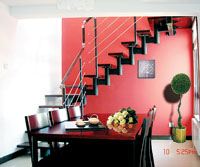 本案例的整體色調(diào)都把握在紅、黑、白之中,這樣的基調(diào)處理正好適合了業(yè)主的視覺選擇,同時,又顯出脫俗的品位和視覺沖擊力??蛷d簡潔的造型頂給本身不算太寬闊的空間留下簡練的線、面結(jié)合體,從而使整個客廳的空間得以更多的延續(xù)。相比之下,餐區(qū)的異型頂就更顯得有些目的性了,它的出現(xiàn)完全是為配合樓梯口的一道斜梁而設(shè)計,這樣從視覺上弱化了斜梁,并采用極具誘惑而又熱烈的紅色作為樓梯背景。