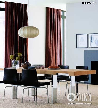2.加長的餐桌適合面積較大的餐廳使用,顯得大氣。同時,在大空間中更要注意色彩和材質(zhì)的呼應(yīng),否則容易顯得松散;原木色餐桌面跟咖啡色厚絨窗簾、淺褐色羊毛地毯顏色十分協(xié)調(diào),餐桌腿所用的金屬材質(zhì)跟餐椅腿也有所照應(yīng),整體性由這些細(xì)節(jié)而得到加強。