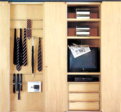 優(yōu)缺點(diǎn):比較好的一種形式是利用一面空墻存放,不完全封閉。優(yōu)點(diǎn)是空氣流通好,寬敞。不過缺點(diǎn)是防塵差,因此防塵是此類衣帽間的重點(diǎn)注意事項,可采用防塵罩懸掛衣服,用盒子來疊放衣物。為便于區(qū)別,可增加一些標(biāo)志。若多設(shè)一些抽屜、小柜,則更為實用。