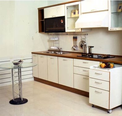 中柜使用上下玻璃移門,使廚房物品收放自如,漂亮物件不妨展示出來,其他東西玻璃擋住可以防塵。
