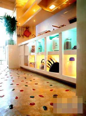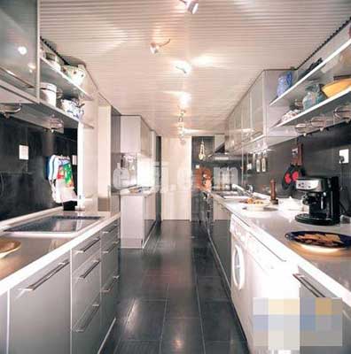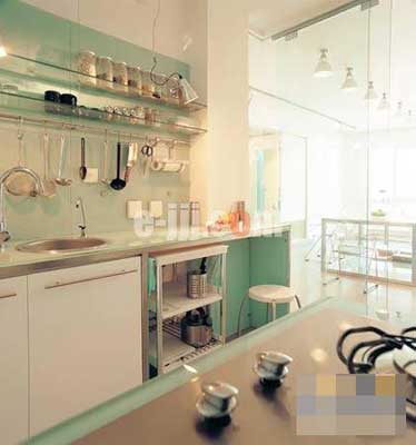 原本極為普通的水泥地面,因?yàn)榍渡狭擞昊ㄊ悴噬袡C(jī)玻璃塊,立即變得活靈活現(xiàn),讓人見(jiàn)之不禁想擺脫鞋襪的束縛,光著腳丫在上面重溫一下海邊嬉戲的快樂(lè)。重新筑建的取代整體櫥柜地位的水泥墻體也毫不遜色,開(kāi)放式的格局設(shè)計(jì),冷熱光源的區(qū)分,讓存儲(chǔ)柜亦是展示柜,廚房小家電及器具既得到了安身立命之所,又成為狹小空間的裝飾點(diǎn)綴。與其它風(fēng)格相比,“一”字型和“L”型簡(jiǎn)約風(fēng)格的整體櫥柜更加適合這種封閉式的廚房空間。以直線條為主的整體櫥柜,因磨砂玻璃的加盟,有效地實(shí)現(xiàn)了期盼已久的瘦身,從視覺(jué)上為廚房減少了一些擁擠感,并為不甘寂寞的早餐桌騰出一席之地;絢麗的櫥柜飾面,不但可以激起人的食欲,在縱橫馳騁于白色瓷磚間的同色調(diào)的勾線和窗簾的配合下,徹底消除了沉悶的封閉氣氛。