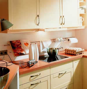 無論哪種材質都怕高溫侵蝕,使用中應當注意避免熱鍋、熱水壺直接與櫥柜接觸,最好置于鍋架上;操作中應盡量避免用尖銳的物品觸擊臺面、門板,以免產(chǎn)生劃痕。應在砧板上切菜、料理食物,除了可以避免留下刀痕之外,還更容易做清潔衛(wèi)生;化學物質對很多材質的臺面有侵蝕作用,例如,不銹鋼臺面沾到鹽就有可能生銹,因此平時還應注意避免將醬油瓶等物品直接放在臺面上;人造板材櫥柜應避免水漬長時間滯留在臺面上。