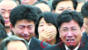 5月23日,韓**下村,盧武鉉的遺體抵達自己的家鄉(xiāng),他的兒子盧建昊(左)和女兒盧靜妍(中)痛哭流涕。 CFP供圖
