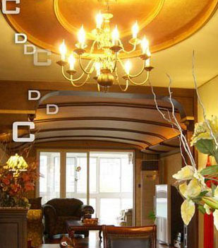 客廳:選用造型豪華的吸頂燈、吊燈多用暖色光源。