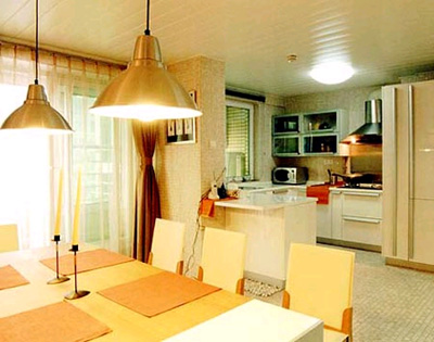 2、廚房與餐廳合并這種布置就餐時上菜快速簡便,能充分利用空間,較為實用。只是需要注意不能使廚房的烹飪活動受到干擾,也不能破壞進餐的氣氛。要盡量使廚房和餐室有自然的隔斷或使餐桌布置遠離廚具,餐桌上方應設集中照明燈具。