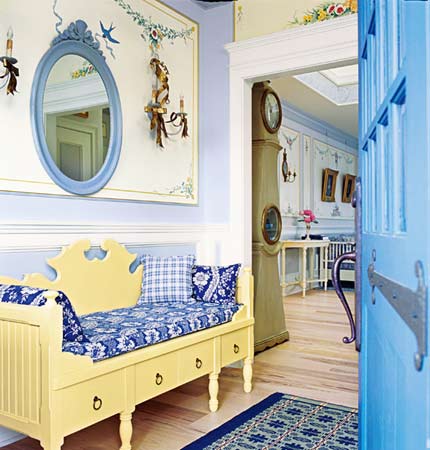 2.利用掛盤和裝飾性粉刷的裝飾手法在瑞典人家里已經(jīng)盛行了幾個(gè)世紀(jì),當(dāng)年流動(dòng)油漆匠游走在鄉(xiāng)村里,用垂花式、月桂花彩斑點(diǎn)、仿大理石花紋等粉刷手法裝飾墻面,至今如此。