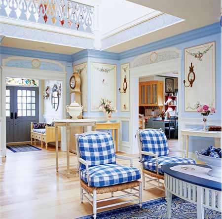 1.方格、條紋圖案的棉質(zhì)布藝色調(diào)以藍(lán)色或紅色搭配白色居多,看上去十分質(zhì)樸,深受古斯塔夫時(shí)期人們?cè)诩揖友b飾方面的喜愛。垂直方向小碎花圖案的壁紙?jiān)谌鸬浼揖又幸卜浅A餍小?