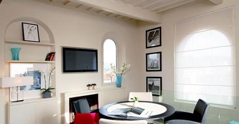 明亮、簡潔的公寓客廳。雖然面積不大,卻井然有序。拱形的窗戶有著典型的意大利建筑風格。