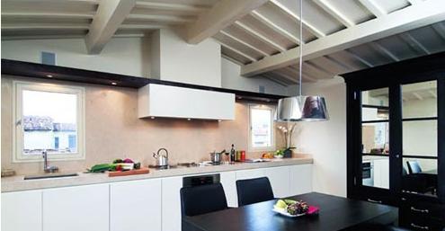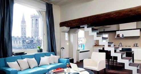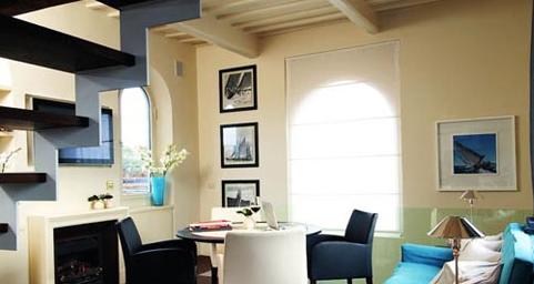 客廳內(nèi)大面積的窗戶,讓陽光暢通無阻。同時將街景以及佛羅倫薩幾百年的老建筑像畫一樣呈現(xiàn)在公寓內(nèi)。加上開敞式的設(shè)計,使得整個公寓一層顯得非常寬敞和舒適。