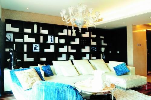 5.客廳的超大書柜成為了最好看的背景,把書按照這種形式擺放只是為了達到一種裝飾效果,和點綴在書柜上的那些相框異曲同工。白色的沙發(fā)、白色的地毯顯得有些單調(diào),但有了旁邊的藍色絲絨貴妃榻,那就是一番別樣的雅致了。這樣設(shè)計也使花花的地板不顯得突出了。