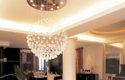 客廳是待人接客的場所,要求營造一種溫暖熱烈的氛圍,因此客廳以選用莊重、明亮的吊燈或吸頂燈為宜。如果房間較高,宜用白熾吊燈或一個較大的圓形吊燈,這樣可使客廳顯得通透,但不宜用全部向下配光的吊燈,而應(yīng)使上部空間也有一定的亮度,以縮小上下空間亮度差別。燈具的造型與色彩應(yīng)與客廳的家具擺設(shè)相協(xié)調(diào)。