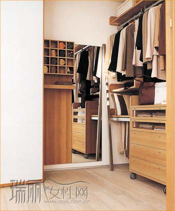 打造更衣室前,要先對(duì)其功能做個(gè)預(yù)想,并考慮好衣服的分類(lèi)方法。不足5平米的小儲(chǔ)藏室如要做成步入式更衣室,建議選用“L”形的衣柜;而狹長(zhǎng)的儲(chǔ)藏室則適用“一”字形的衣柜。
