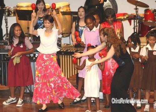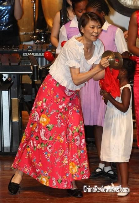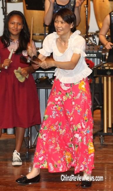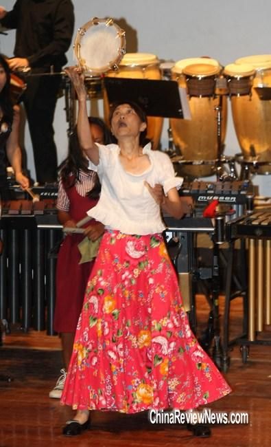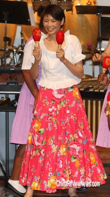 周美青28日(當(dāng)?shù)貢r(shí)間)觀賞打擊樂團(tuán)表演時(shí),上臺同樂,一連玩了4種樂器,并配合節(jié)奏韻律搖擺,熱力四射。