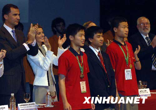 資料圖片:2008年7月21日,西班牙王儲費利佩(后左一)和王妃萊蒂西亞(后左二)等為國際數學奧林匹克競賽三位滿分獲得者鼓掌,中國隊選手牟曉生(前左一)、韋東奕(前左三)及美國選手阿歷克斯·翟(前左二)是本次比賽的三位滿分獲得者。