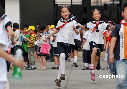 2009年5月31日,浙江舟山小學(xué)的小學(xué)生開心地做著游戲。當(dāng)天,該市舟山小學(xué)舉辦“快樂六一 我做主”游藝活動(dòng)。 中新社發(fā) 琳紅 攝