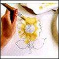 步驟三 用大頭針在布上準確確定花紋位置,首先選用淺白色,用膠布蠟紙粘在織物上以防蠟紙移動。