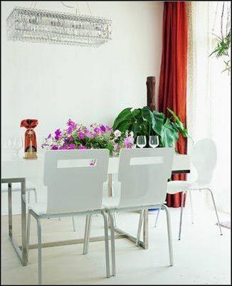 客廳與餐廚空間是開(kāi)放貫通的,白色的鋼架桌椅,剔透的水晶吊燈和酒具,一捧盛放的鮮花,格外養(yǎng)眼。