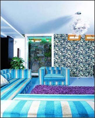 打開(kāi)聽(tīng)覺(jué)、視覺(jué),一切感觀。自然的采光景觀和綠色墻紙?zhí)羝鹨晃莸那逖?。深灰藍(lán)地面、條紋沙發(fā)支起一墻攀滕。