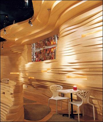 SongClub是一個(gè)為音樂(lè)而生的空間,作為音樂(lè)餐吧,Song兼具了多重功能,是餐廳又是酒吧,可以舉辦演出,同時(shí)還**唱片。為解決多功能同置一室的沖突,仲松特意為這410平米的空間設(shè)置了大量延綿不斷的木質(zhì)曲線,笑稱(chēng)其為“室內(nèi)的山地景觀”,這些曲線將可能的沖突聯(lián)系起來(lái),并融為一體。在這里,木質(zhì)的曲線并非單純裝飾所用,它更是空間與空間之間的隔斷,是高低錯(cuò)落的座椅,是空間中流淌的韻律……你可以隨意自由地穿梭,也可以與人保持著安全距離。