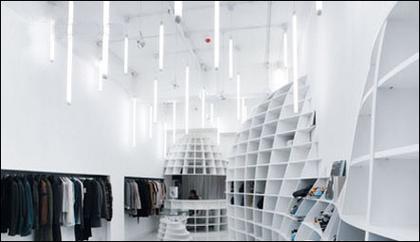 “生長(zhǎng)”是仲松為這個(gè)空間里的實(shí)用曲線設(shè)計(jì)定義的概念,并非在強(qiáng)調(diào)空間物理可變形,而是在不同時(shí)段與氛圍下,讓空間能夠給環(huán)境體驗(yàn)者提供豐富的感官可能性,并強(qiáng)調(diào)了使用者與設(shè)計(jì)間的互動(dòng)關(guān)系。設(shè)計(jì)師在理念上將Waterstone設(shè)計(jì)為一種裝置,曲線帶給空間的連貫性促成了這種交流的發(fā)生,空間相位的多樣性增添了這種交流的趣味性,在這里,設(shè)計(jì)表達(dá)并非單純出于對(duì)視覺(jué)的滿足,更是一種人體感官上的全方位體驗(yàn)——無(wú)論是像太空艙一樣的獨(dú)立更衣區(qū)域,還是斷點(diǎn)連續(xù)的陳列區(qū),或者是角落充分利用空間的曲線格架,都是為了強(qiáng)調(diào)一種全面感受而生。