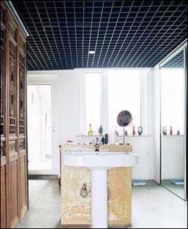 找回屬于自我的生活空間。全開放式的浴室與臥室渾然一體,只用吊頂和綠色植物的位置來進(jìn)行隱性分區(qū),浴缸后面的墻壁用馬賽克鋪貼出方形圖案,既是一種防潮處理,又與周圍灰色的碎石粒墻面形成色彩上的統(tǒng)一。