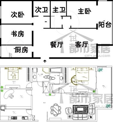 對(duì)此,設(shè)計(jì)師做了如下的調(diào)整:首先設(shè)計(jì)師把廚房的一角墻面向書房推入,從而開辟出放冰箱的空間來;主衛(wèi)的外間被作為儲(chǔ)物區(qū);主臥中多余而浪費(fèi)空間的墻面也被拆除掉。最終的平面布置如圖所示。
