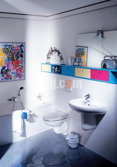 這類衛(wèi)浴間改良起來難度最大,雖然面積不少,可由于寬度有限,潔具的擺放總會受到限制。選擇一些特種的潔具是最好的方法。