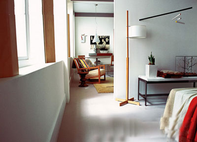 另一些重要的裝飾自然是照明設(shè)施了,由于在白天拍攝,我們幾乎忽略了這些分布在角落的燈具,它們更像是主人精心挑選的裝飾品,與大結(jié)構(gòu)和色調(diào)渾然一體。圓錐形吊燈與簡(jiǎn)約的白色餐桌的搭配組成了一個(gè)完整的功能區(qū);與之相呼應(yīng)的是客廳沙發(fā)旁的落地?zé)簦擅畹貙⑷齻€(gè)簡(jiǎn)單的圓錐體組合,為房間上下兩側(cè)同時(shí)提供照明;臥室的落地?zé)襞c墻面的裝飾物搭配,把這個(gè)角落設(shè)計(jì)成一件完整的藝術(shù)作品。