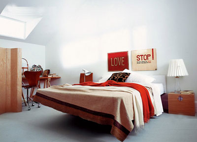 臥室的布置是舒適柔和的,大件的家具都采用了溫和的質(zhì)地和色彩,而床頭上方的艷麗海報(bào)又成為了增添情趣的點(diǎn)睛之筆。